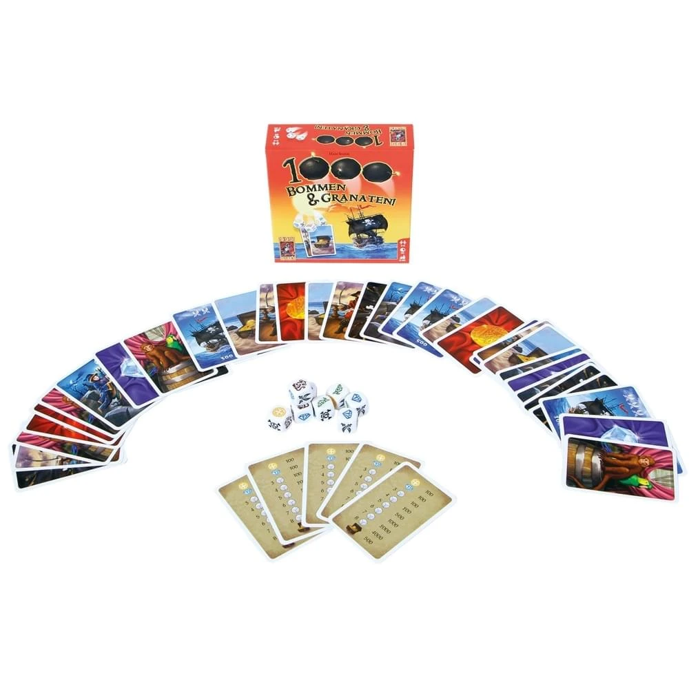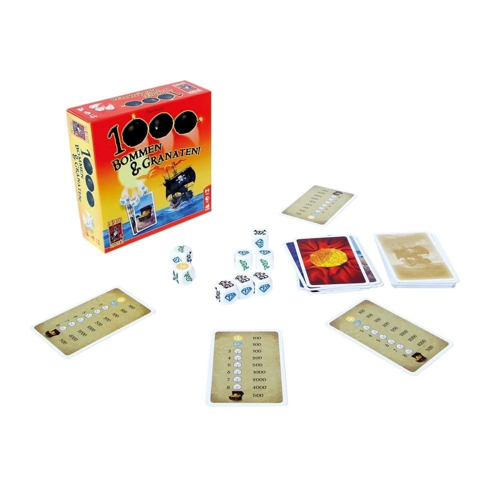 In 1000 Bommen en Granaten! probeer je met 8 dobbelstenen zoveel mogelijk gelijke symbolen te dobbelen. Je mag zo vaak opnieuw dobbelen als je wilt, maar schedels moet je opzij leggen. Gooi je een derde schedel, dan is je beurt direct voorbij en scoor je geen punten. Een piratenkaart geeft je mogelijkheden en beperkingen in je beurt aan.