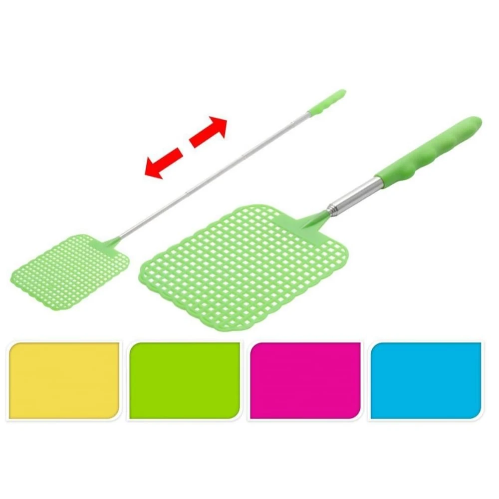 Deze vliegenmepper is uitschuifbaar. Zo ligt hij niet de weg, maar heb je hem wel bij de hand.