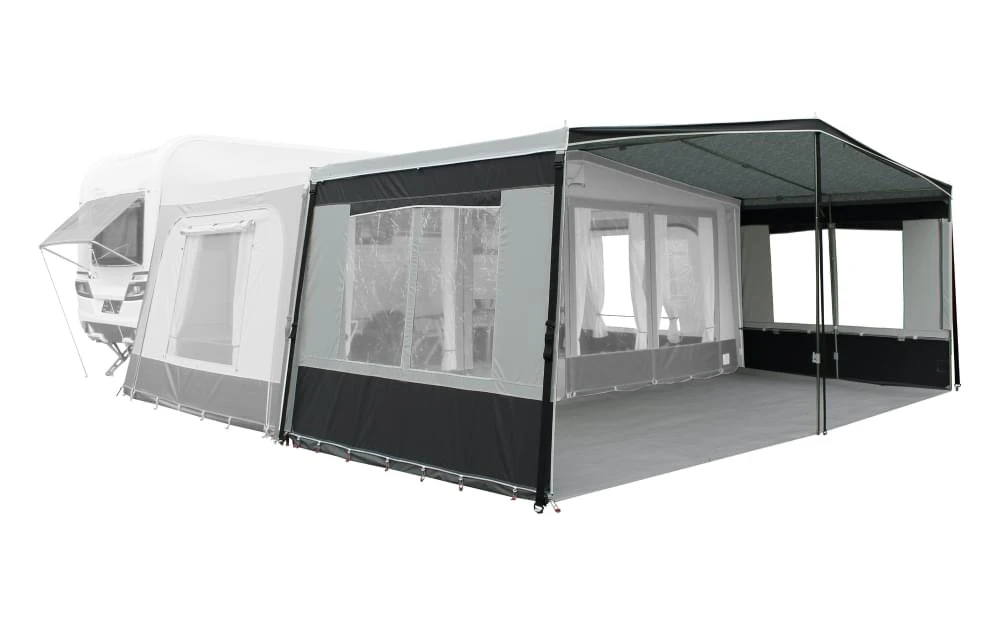 De Genova Premium Staal is een extra stevige voortentluifel van Reda. Met zijn 260 grams Ten Cate Residential dak kan deze seizoens voortentluifel tegen een stootje en staat hij garant voor vele jaren gebruiksgemak. Standaard wordt deze luifel geleverd met uitritsbare zijwanden en een stormset. De stormset bestaat uit 4 stormstokken, 4 verandastangen en 2 daksteunen.