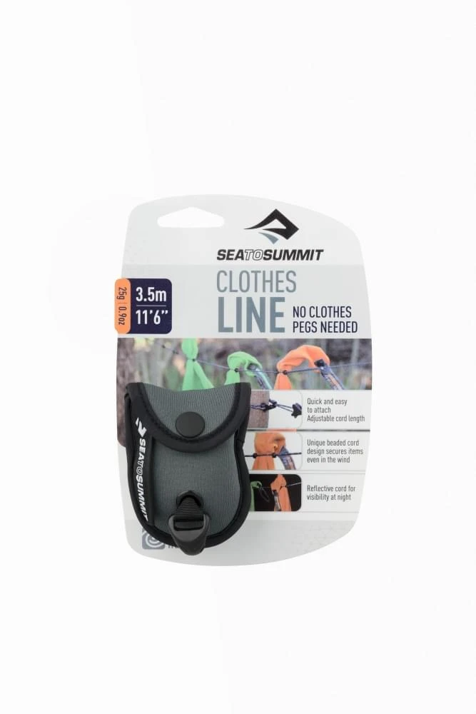 Sea to Summit heeft jaren terug de meest handige kledingwaslijn bedacht die je maar kunt bedenken. Een waslijn zonder knijpers, hoe bedenk je het, maar hij bestaat. The Clothesline is een 3,5 meter lange waslijn die je zeer eenvoudig aan een boom vastmaakt middels een paar clipjes.